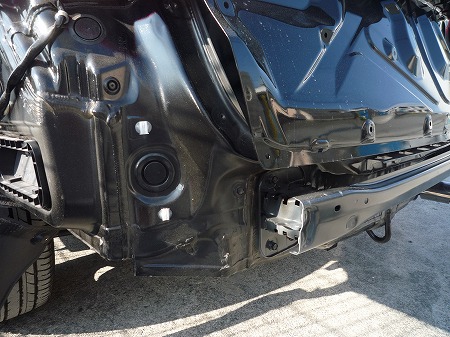 ダイハツコンテのリヤゲートを取替て、バックパネルを修理しています。バックパネルはポートパワーを使って、中から押し出しています。
